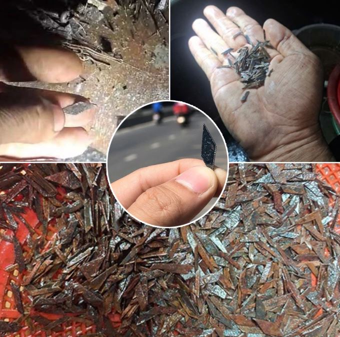 Sau khi kiểm tra, các tình nguyện viên phát hiện các đinh hình thoi sắc nhọn còn mới, nghi vừa bị “đinh tặc” rải xuống đường.